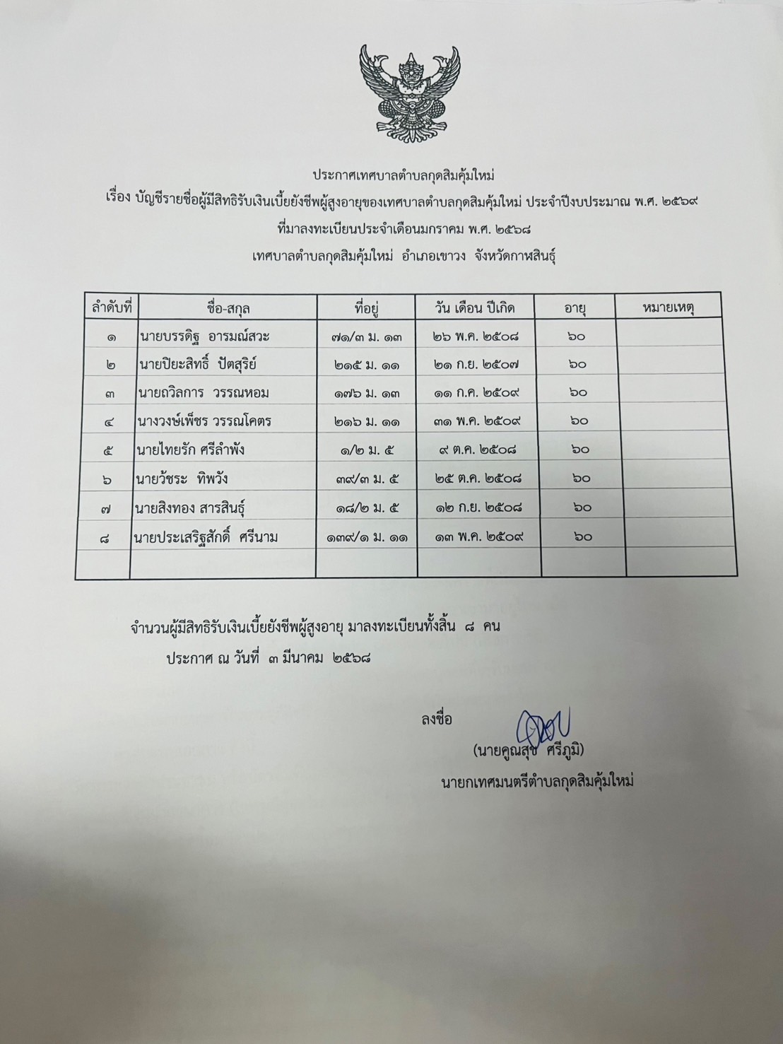 บัญชีรายชื่อผู้มีสิทธิรับเงินเบี้ยยังชีพผู้สูงอายุ ของเทศบาลตำบลกุดสิมคุ้มใหม่ ประจำปีงบประมาณ 2568