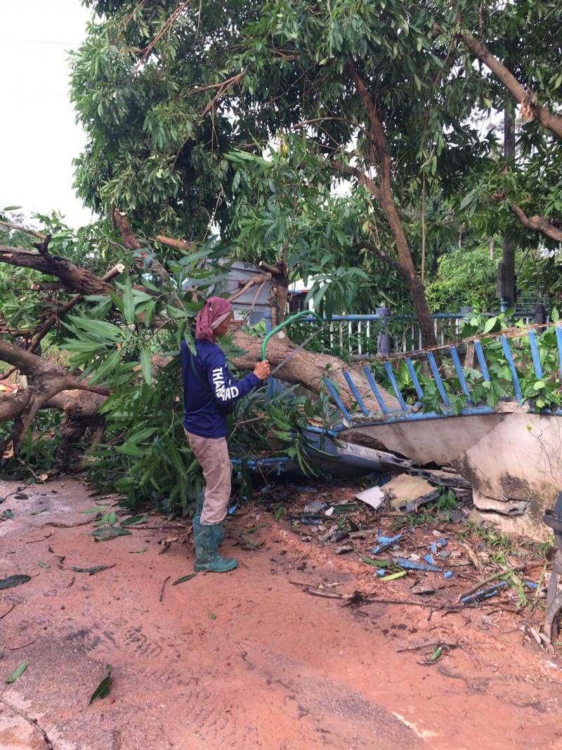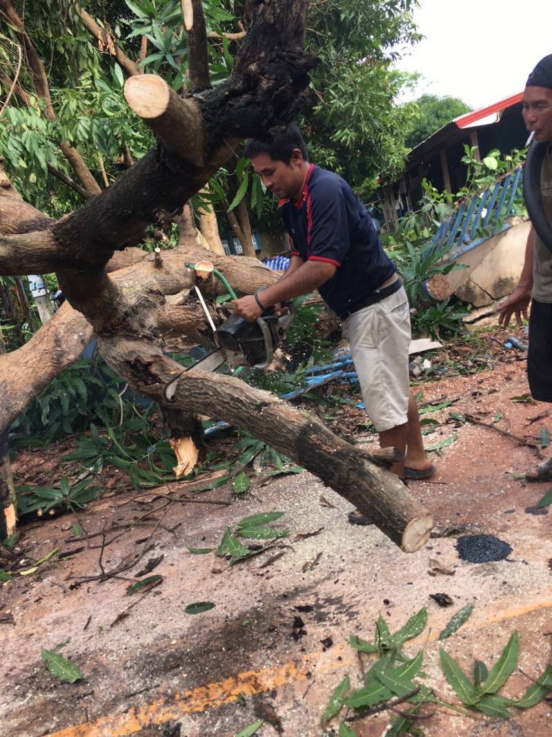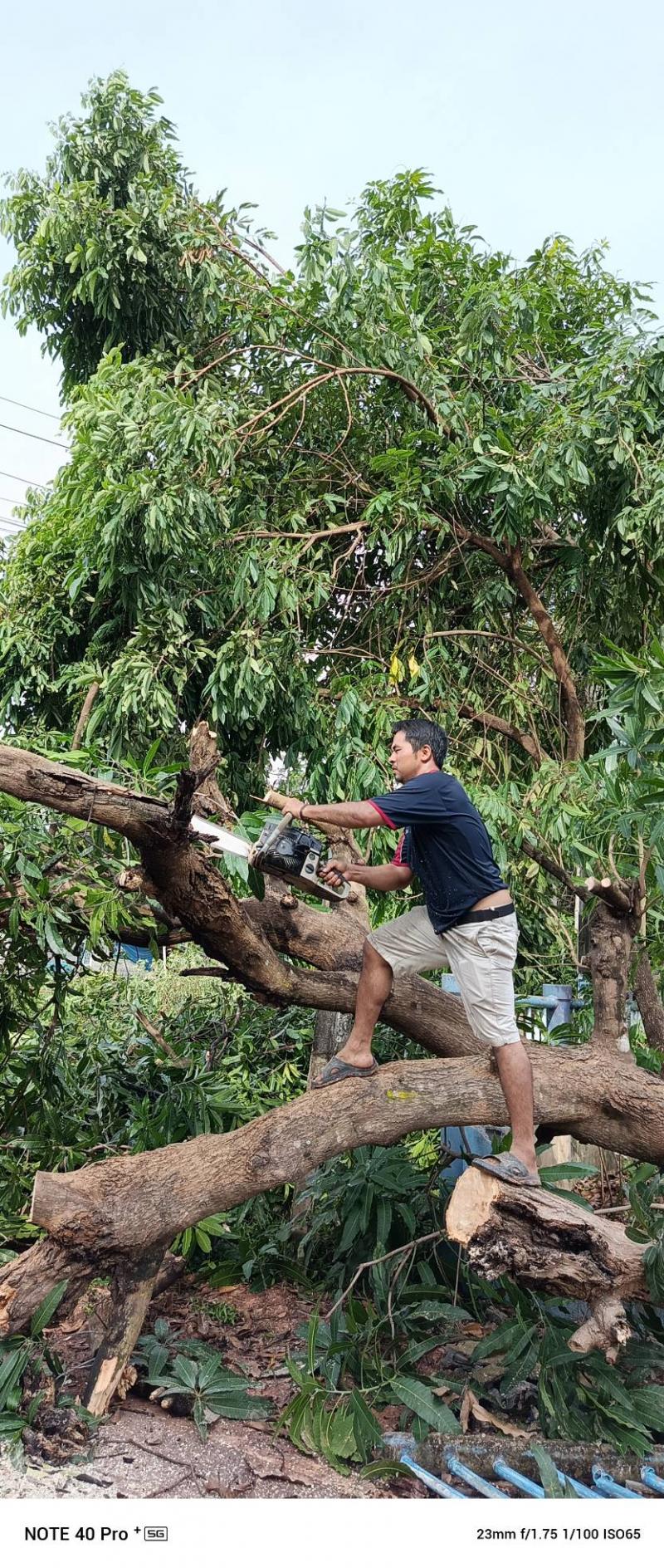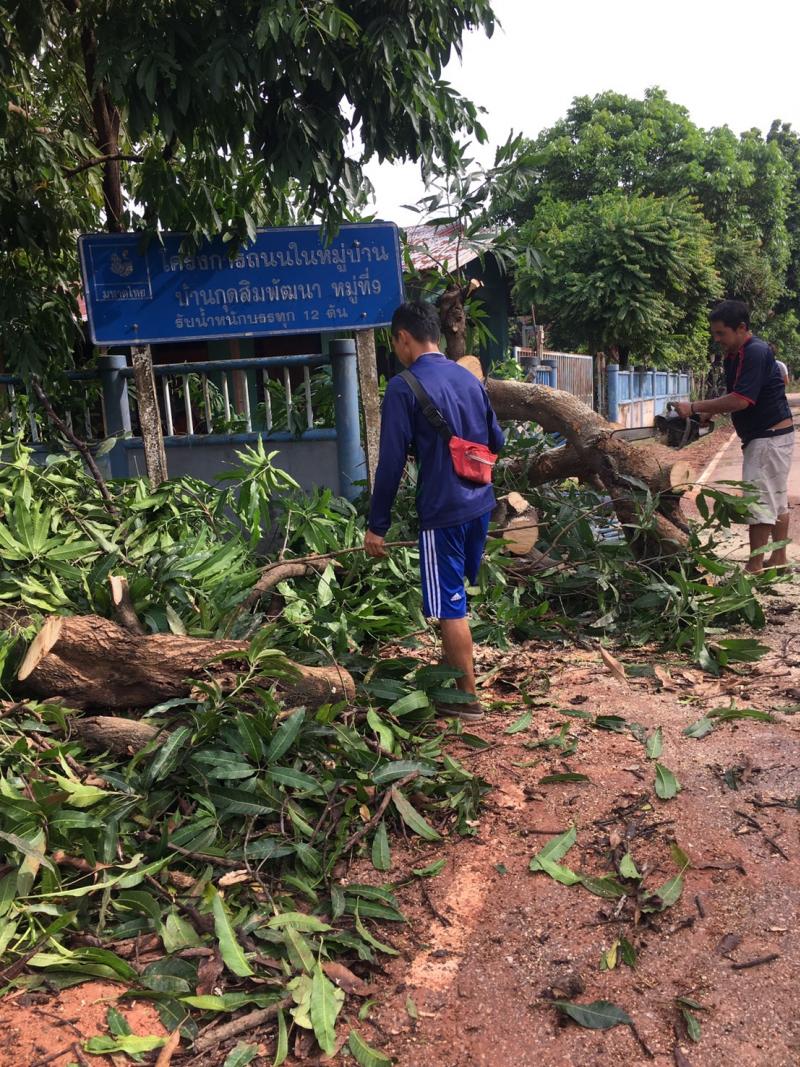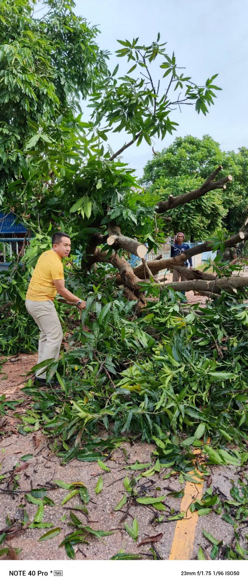 งานป้องกันและบรรเทาสาธารณภัย เทศบาลตำบลกุดสิมคุ้มใหม่ ร่วมกับชาวบ้านหมู่ที่ 9 ตำบลกุดสิมคุ้มใหม่ ตัดต้นไม้มะม่วง ล้มทับถนนกีดขวางการจราจร