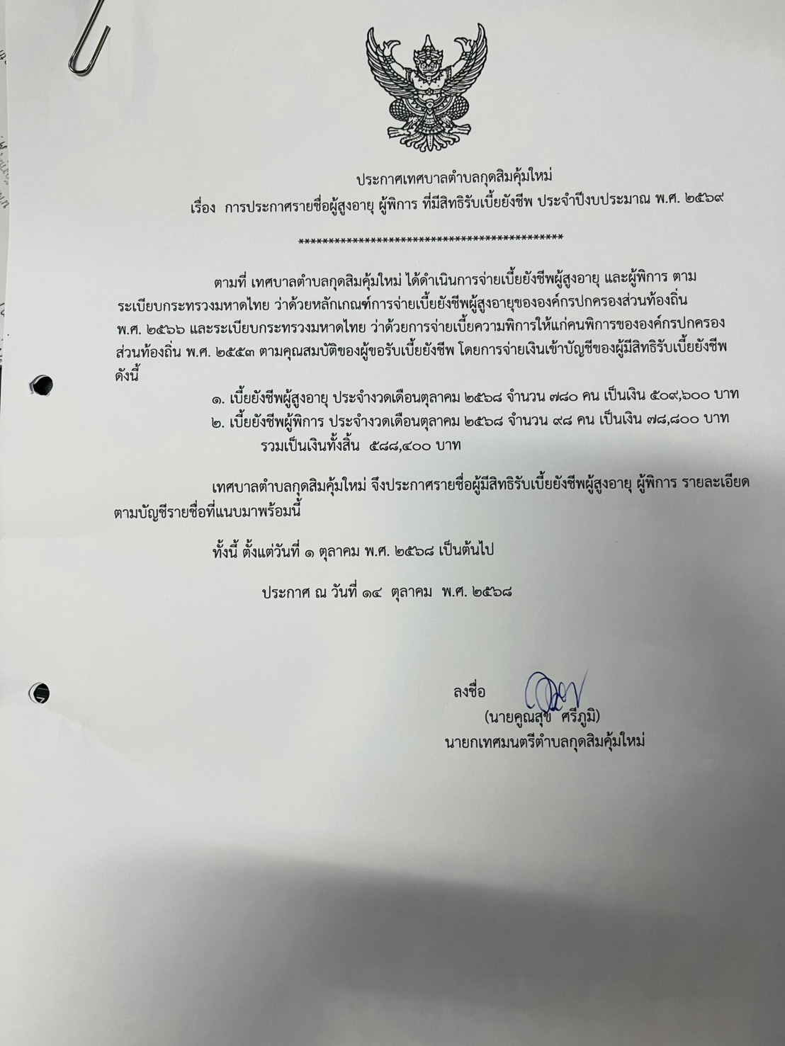 การประกาศรายชื่อผู้สูงอายุ ผู้พิการ ที่มีสิทธิรับเบี้นยังชีพ ประจำปีงบประมาณ พ.ศ.2569